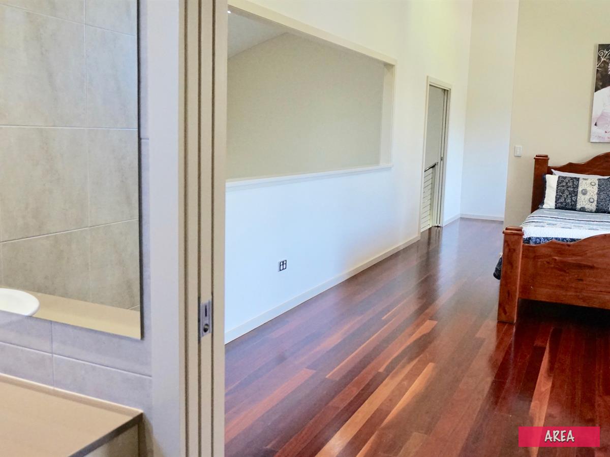 The house is spread over two storeys with the master suite taking up the entire upper level with an open space overlooking the lower level. The upper level is a very spacious glamorous parent’s retreat with its own sitting room, bedroom, walk in robe and large ensuite. The lower level has a bedroom wing with 3 built in bedrooms, big main bathroom and a built-in laundry with extra storage. The living area will take the largest of dining tables and has enough wall space to hang a sizeable art collection and room left over for a number of big comfy sofas. The kitchen is a well-planned work space with everything in easy reach. You can tell this kitchen was planned by a very busy woman! Opening off the kitchen is a tiled lock up garage that will house 3 vehicles and at the end of the garage is a very spacious media/hobbies/games room.