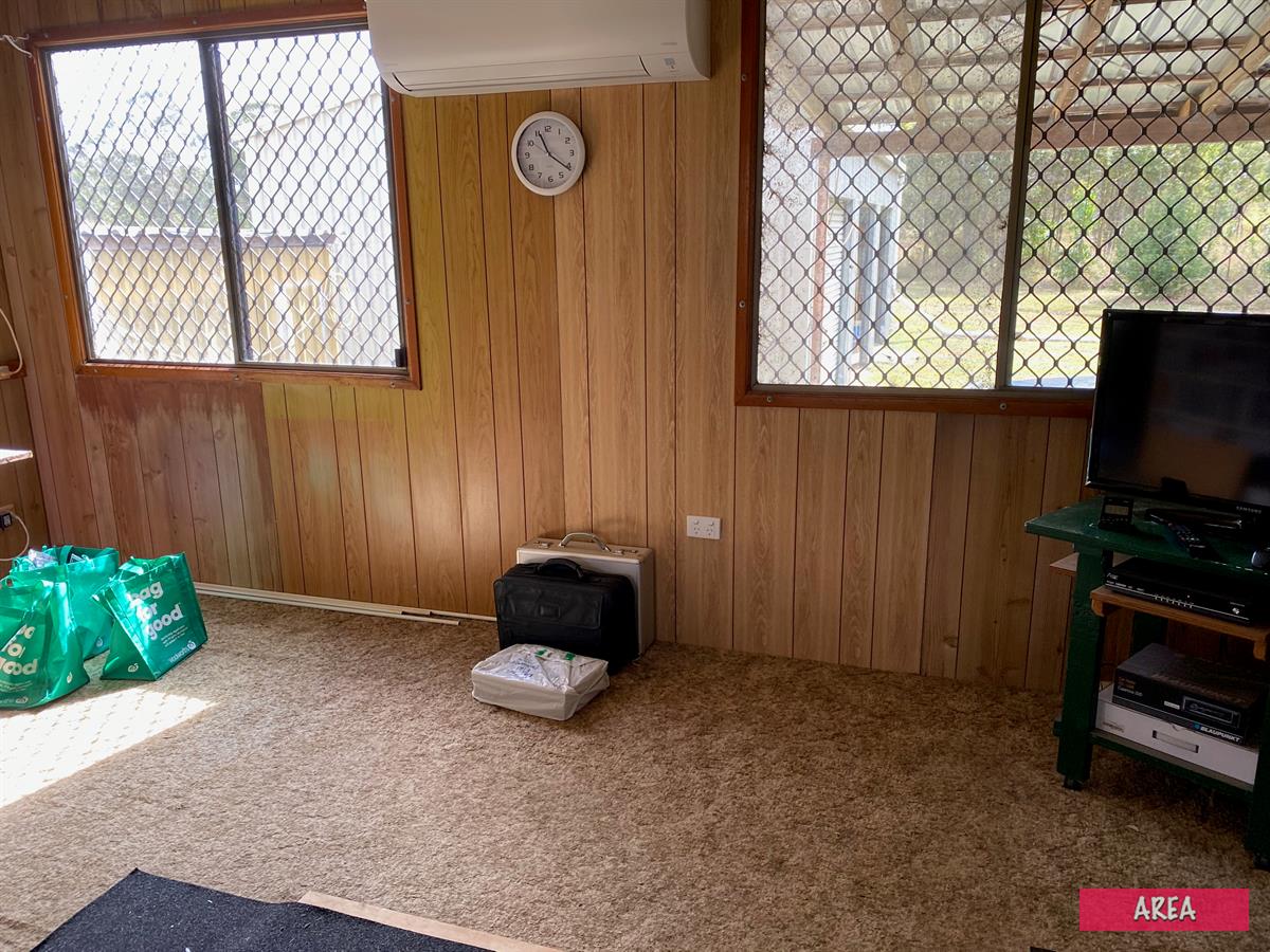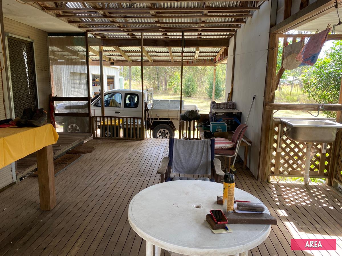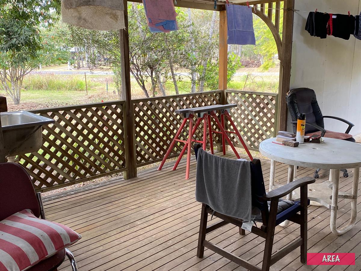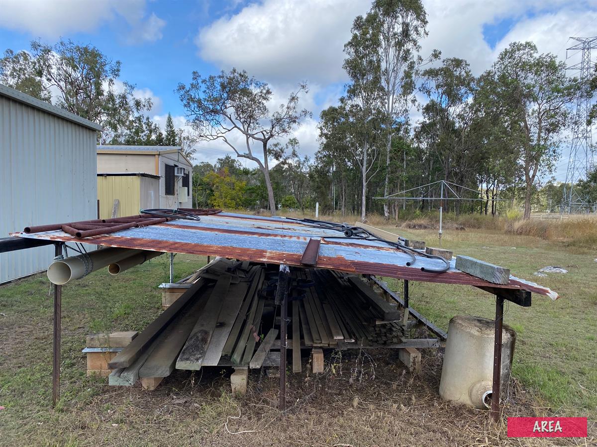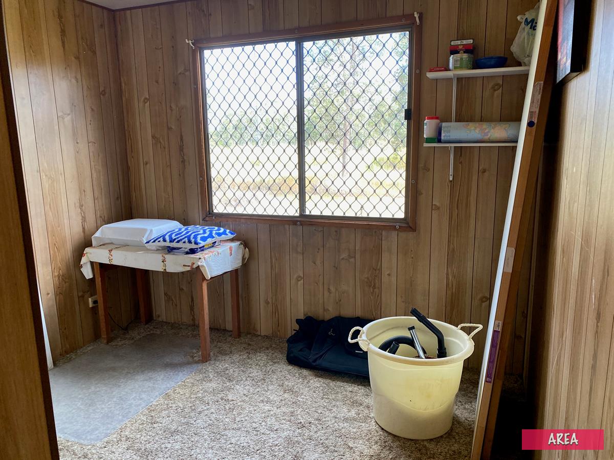 There's a large aluminium clad donga on steel stumps. (2 bedrooms, 1 bathroom, kitchenette, living plus attached large verandah and carport.) Split system air con, new hot water system, security screen all- round, built in shelves in bedrooms. This donga is not a traditional dwelling and does not have the normal approvals a house would have. Some mature trees include jacarandas and Bradbury Pear.
