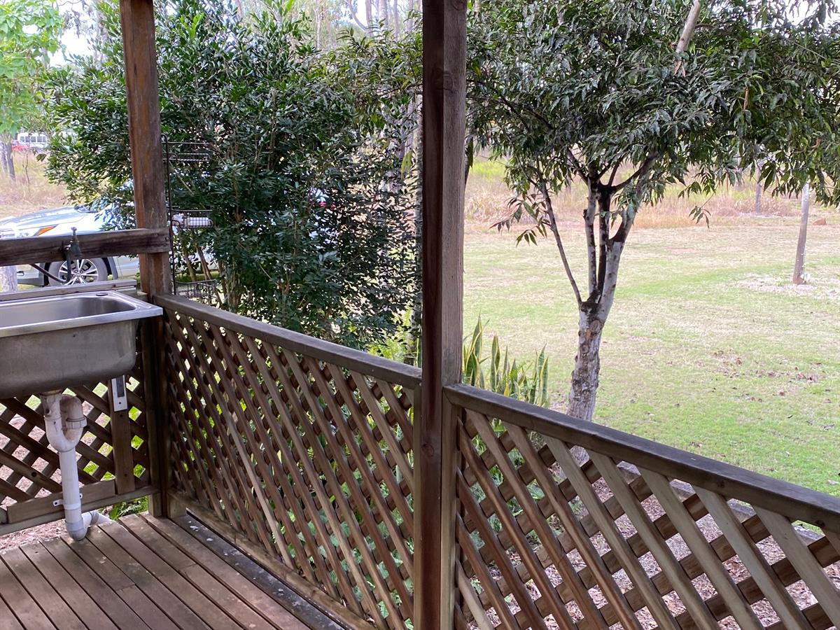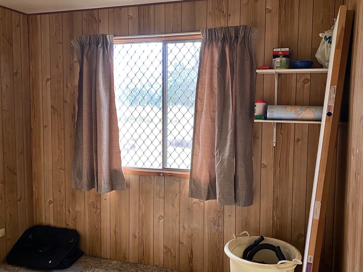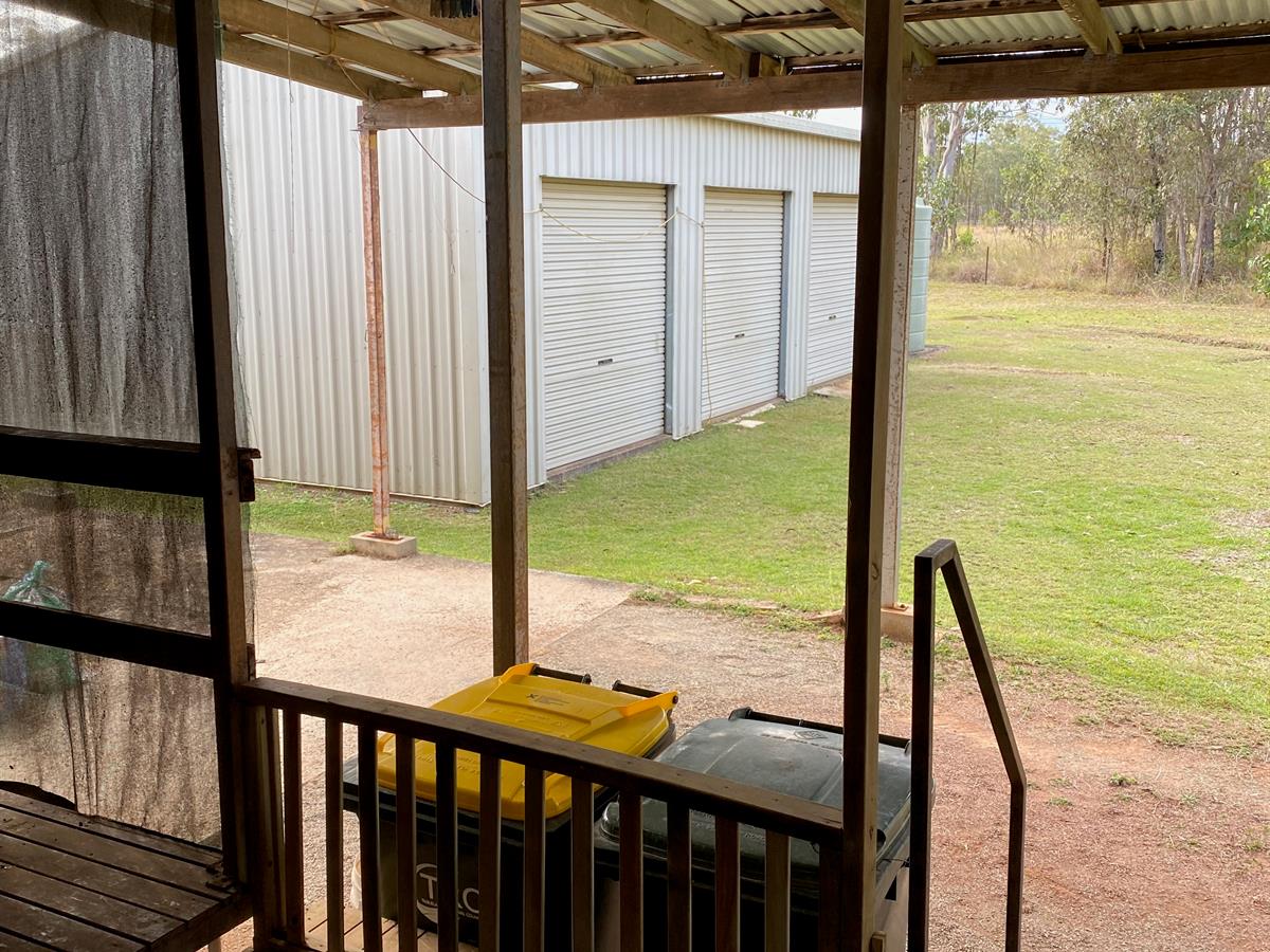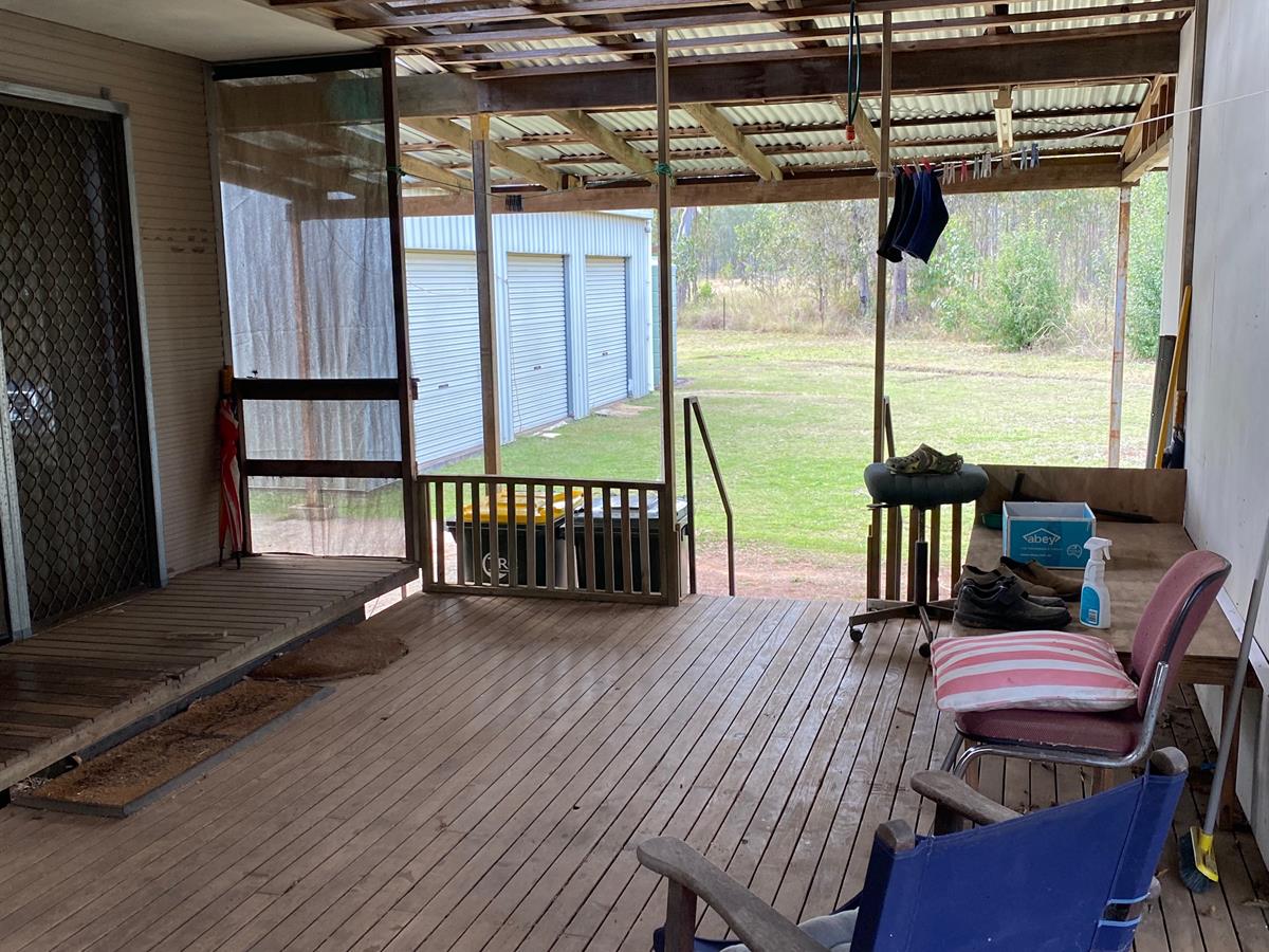There's a large aluminium clad donga on steel stumps. (2 bedrooms, 1 bathroom, kitchenette, living plus attached large verandah and carport.) Split system air con, new hot water system, security screen all- round, built in shelves in bedrooms. This donga is not a traditional dwelling and does not have the normal approvals a house would have. Some mature trees include jacarandas and Bradbury Pear.