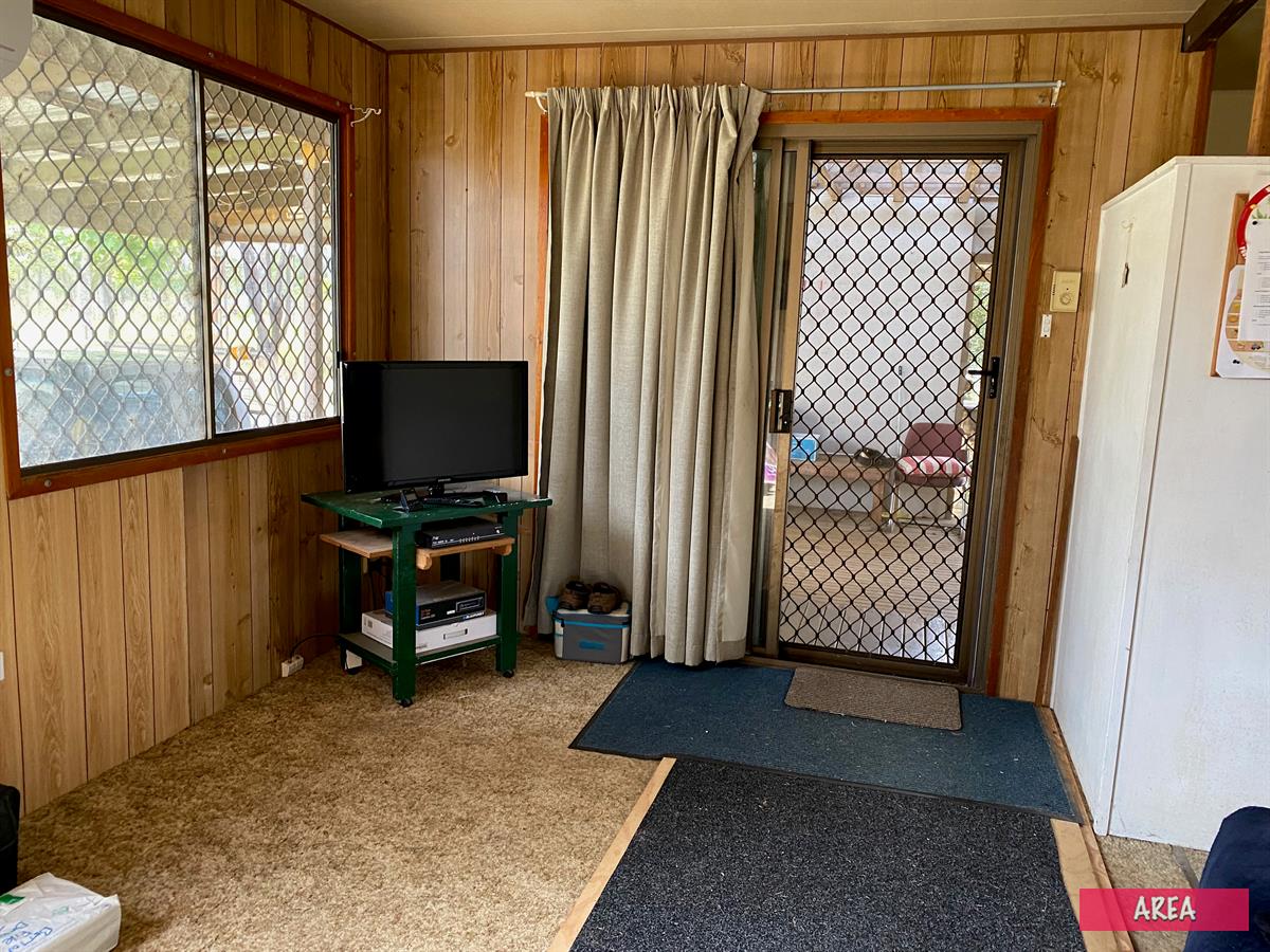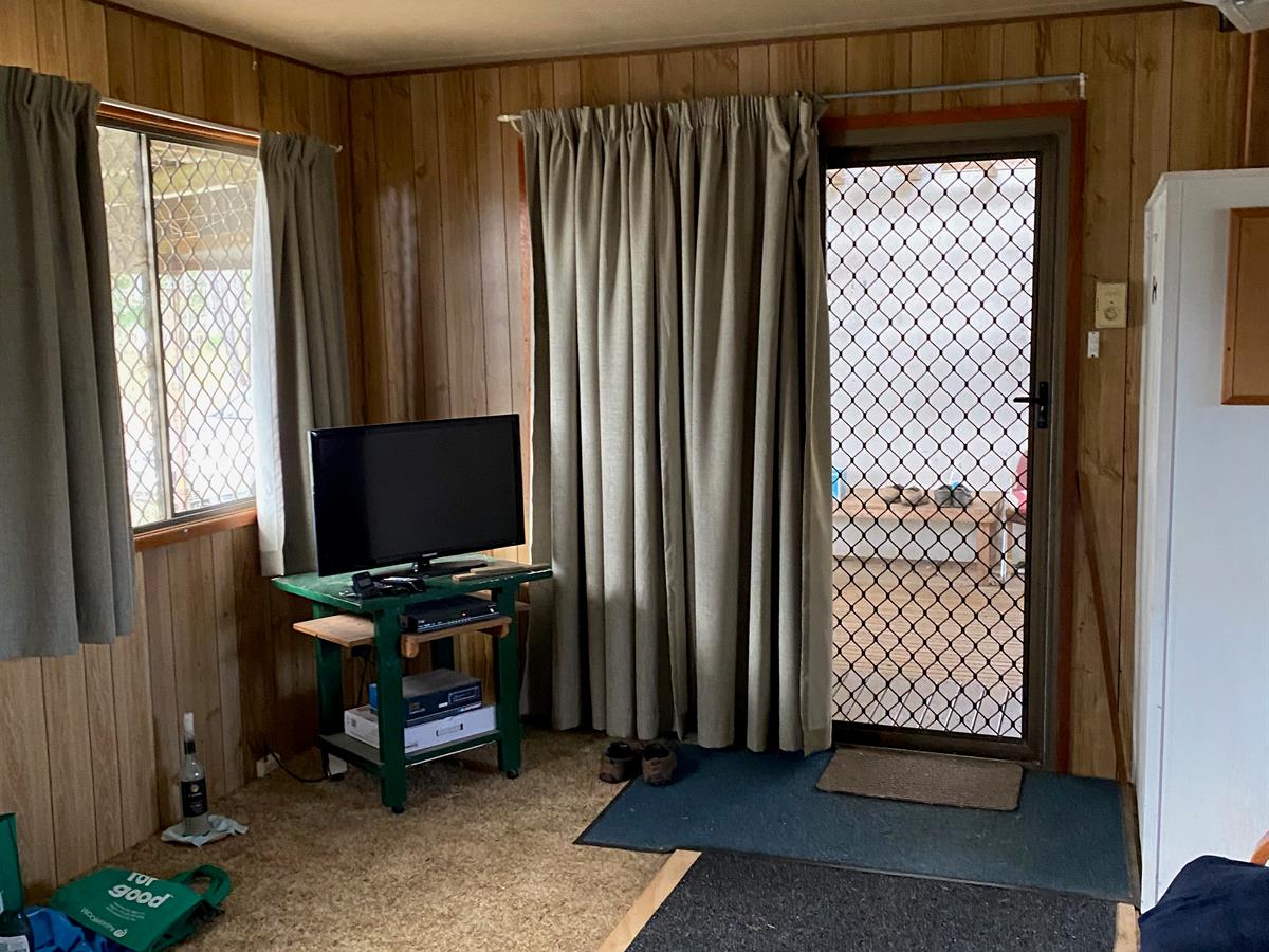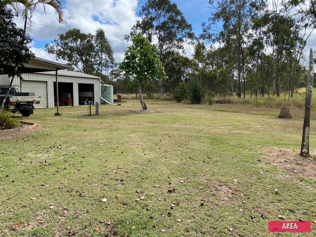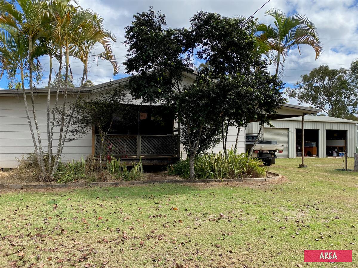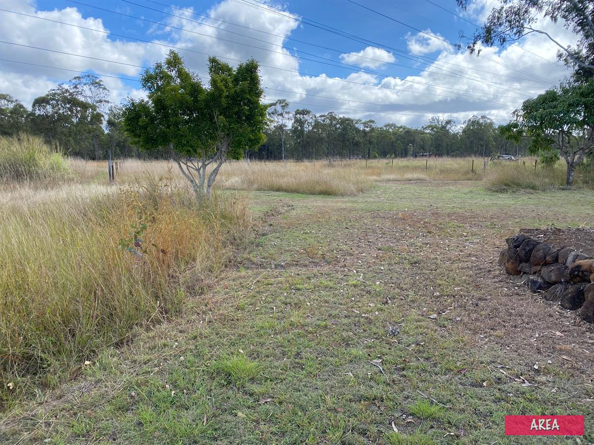 There's a large aluminium clad donga on steel stumps. (2 bedrooms, 1 bathroom, kitchenette, living plus attached large verandah and carport.) Split system air con, new hot water system, security screen all- round, built in shelves in bedrooms. This donga is not a traditional dwelling and does not have the normal approvals a house would have. Some mature trees include jacarandas and Bradbury Pear.